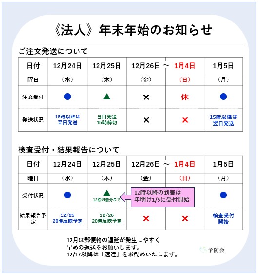 ご返送いただく検査物の到着が、通常よりも遅延する可能性がございます。