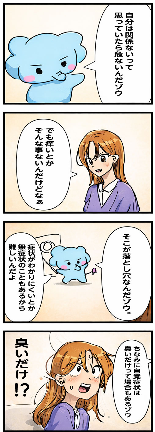チェックリストで「可能性が高い」と出ても、実際は別の皮膚疾患であることもありますし、逆に「可能性が低い」と出ても無症状で感染しているケースが多々あります。最終的には検査キットや病院での検査が必要です。